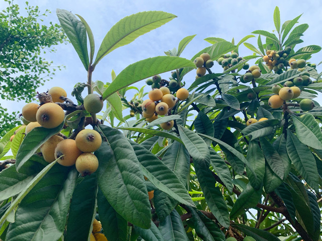走近枇杷樹的一瞬間,空氣中甜甜的水果香味撲鼻而來,綠油油的枇杷樹葉迎著陽光盡情展開著,葉子之間下面鑲嵌著一顆顆成熟金黃的枇杷。